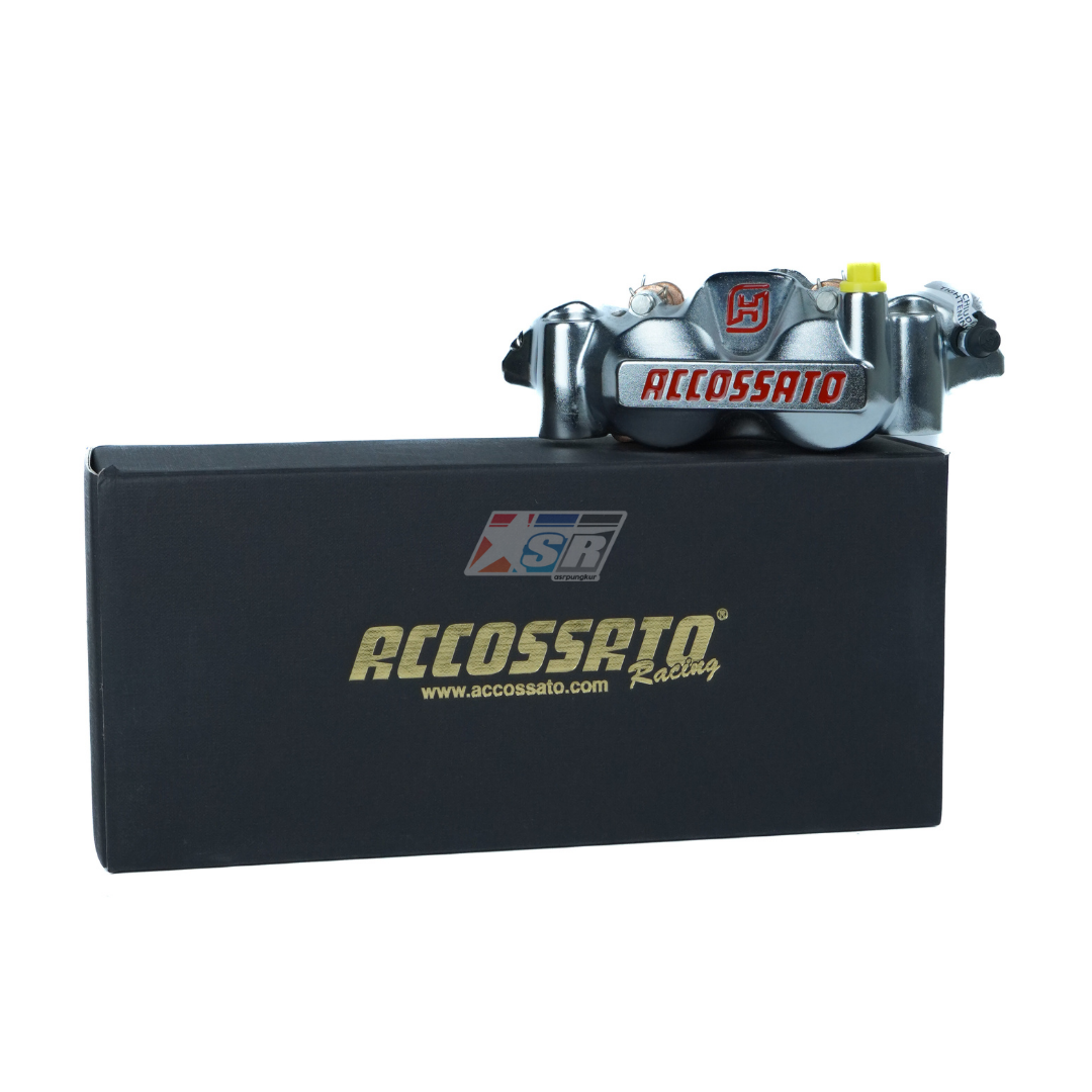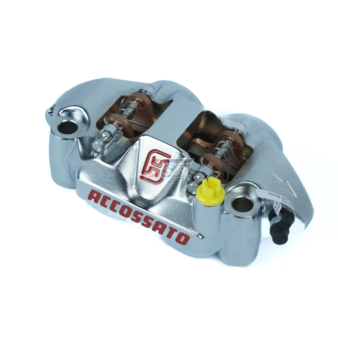 Kaliper Rem Radial Accossato MonoBlok PZ004 Kanan adalah kaliper premium berteknologi tinggi yang dirancang untuk performa maksimal. Dibuat menggunakan proses CNC Billet Monobloc dari aluminium penuh, kaliper ini memiliki bobot sekitar 900 gram (setara dengan Brembo GP4RS), menjadikannya lebih ringan daripada model sekelas lainnya.